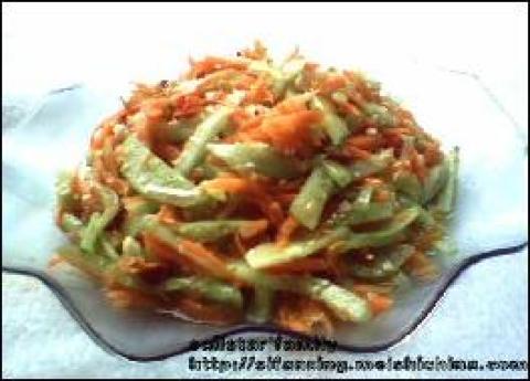 3.红萝卜、黄瓜丝加盐、酸辣椒沫、芝麻倒入刚烧熟的油后加鸡精、少许麻油拌均即可。