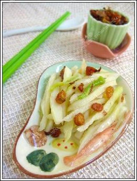 3.烧热油锅,入葱花(注意别焦了),关火浇在茭白丝上ok了.吃的时候拌开.