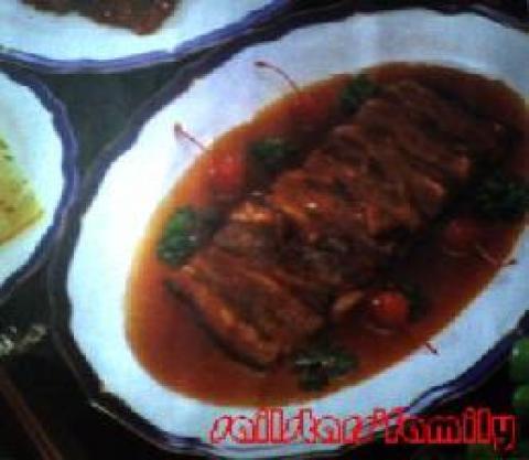 牛白腩675公克,芝麻饼8张,荷叶2张,玻璃纸1大张,麻绳1条(约200公分),耐火土4公斤,樱桃,清水一杯半,葱3支,姜1大块,辣椒2个,八角5粒,盐3分之1小匙,味精3分之1小匙,酱油3大匙,米酒2大匙,冰糖1小匙,糖色1小匙,清水3杯