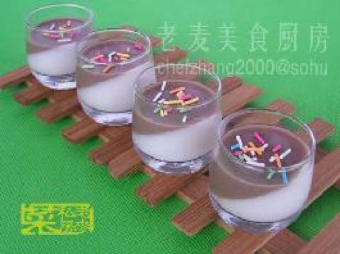4.重新开火,加可可粉加水调成稀糊,倒入余下的浆料中搅匀(也可将可可粉直接加入,不过需要搅匀后过滤)。然后掺入杯中,与原来的齐平。