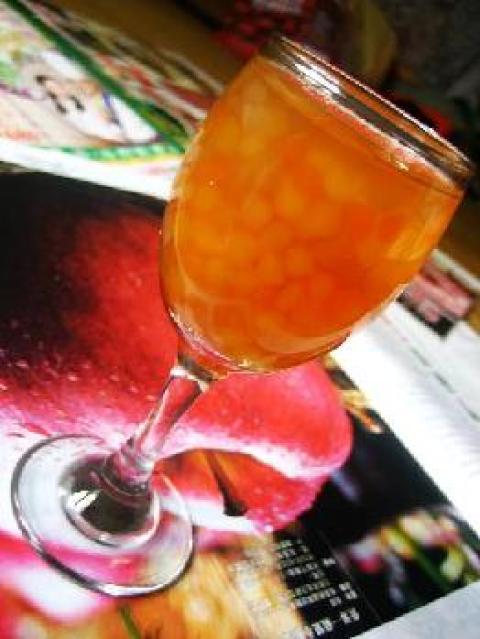 3.将西米从冰箱中取出倒到橙汁中即可饮用(也可用其他饮料代替,但最好不是酸性饮料)。