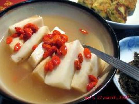 淮山应该蒸熟后再剥皮,这样子才会白嫩。 俺煮的太久,枸杞的颜色影响了美观,而且加的水太多了。