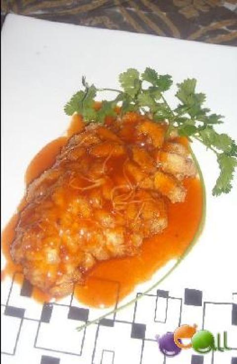 此菜的关键在于花刀的处理 还有复炸时,味儿汁儿的调制与糖醋鱼类同 你也可以用真正的葡萄汁做这个 还可以用浓缩的橙汁做,都是非常不错的