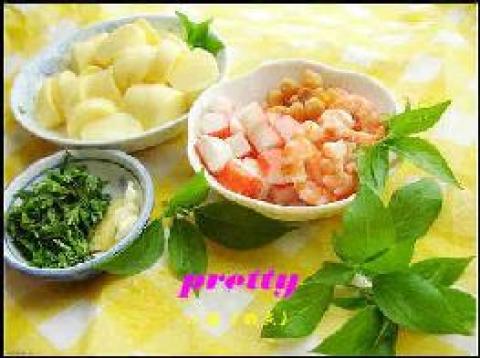 虾仁,九层他(罗勒),姜片蒜片,干贝,蟹柳,玉子豆腐