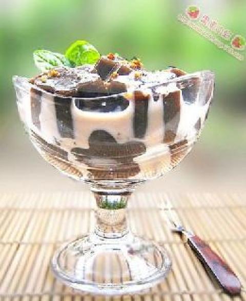 上面说的比例是:水(桂花茶)15:凉粉粉1,凉粉只需很少分量。 因为黑凉粉是用凉粉草来做的,所以会有一阵轻微的凉茶味道,用桂花茶充当清水去煮,就会掩盖了那种气味。凉粉夏天吃可以清热哦~~~和龟苓膏一样功效的。可能因为煮的时候加了点炼奶,所以,本来黑色的凉粉变成了深啡色。