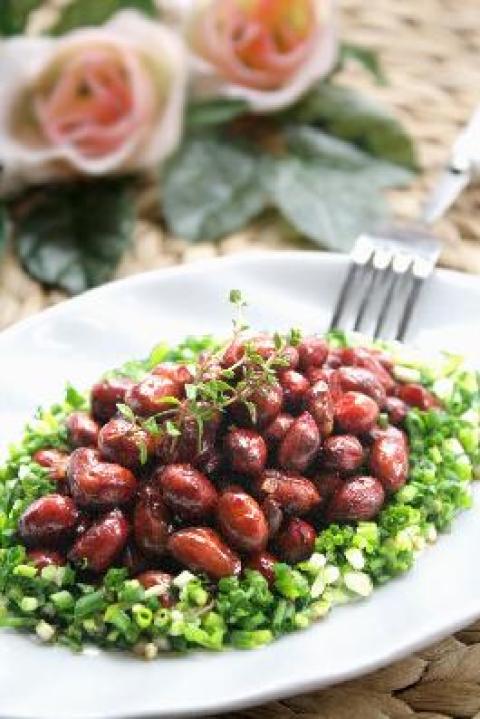 花生泡后炸出来口感更佳; 花生可使降低胆固醇、花生仁红衣既可补虚,又能止血。但1颗花生的热量大约在5卡-6卡左右,减肥的筒子要注意哦。 醋具有增进食欲、促进消化、杀菌等功效。
