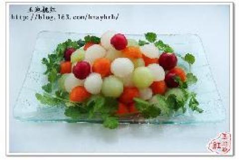 1.将白萝卜、胡萝卜和莴笋削去外皮,用挖球器挖成球形。