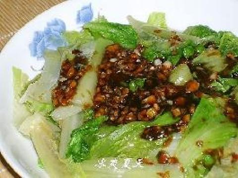1.生菜洗净,撕大片儿,滚水落糖,放入生菜烫熟盛出装盘,