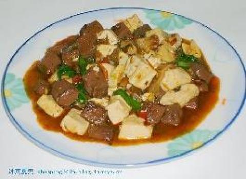 2.热油锅,将绞肉及姜末、蒜末辣椒酱略微煸炒后,放入酱油、糖、1/2碗水后及作法1的豆腐、鸭血以小火略烧1分钟,再以太白粉勾薄芡,起锅前洒上香油、葱花及花椒粉即可。