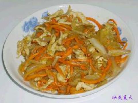 2.锅留底油,放入胡萝卜丝、洋葱丝翻抄。