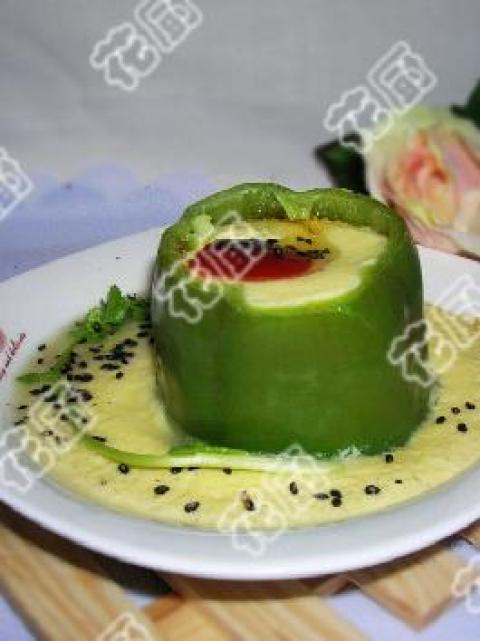 2.步骤1)蒸锅倒入凉水煮开后,倒扣一个盘子(因为我没有大蒸锅,只能用这个蒸饭的锅代替了).2)再在上面加一个盘子,就是盛青椒的盘子.3)放入装入蛋液的青椒.4)把另一半的蛋液轻轻的倒入盘子中,青椒放在中间.5)盖上盖蒸五钟.关火后,我怕不熟又焖了5分钟.6)出锅时点缀了香菜,麻油与番茄沙司.注:最后吃的时候拌匀即可,因为在蛋液中加了盐,我在吃的时候又点缀了黑芝麻,大家还可以自由发挥的,随你喜欢加调味.