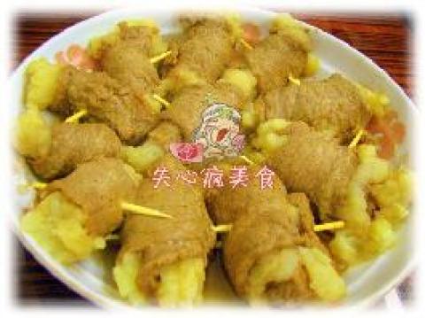 6.将铺好土豆泥的牛肉卷成卷,用牙签穿上,避免散落
