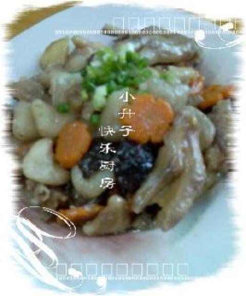 4.烧热锅,下油,爆香蒜末,辣椒,姜片,香菇,把鸭脚倒下去炒香,再下菱角,加几片胡萝卜一起炒,然后下足够的水烧开,转沙锅煲一个钟头,下盐味精调味,洒些葱末,盛盘就ok了.