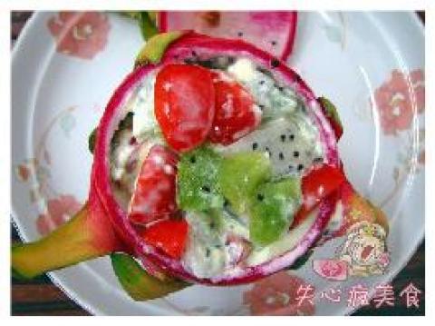 6.将各色水果丁倒入调好的沙拉酱中,拌匀,装入火龙果里,入冰箱冷藏