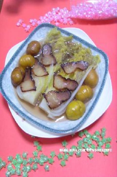 1.娃娃菜一颗、栗子6颗、腊肉适量
