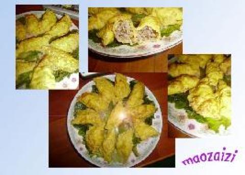 3.肉沫用盐,味精,淀粉,葱调好味后,像包饺子那样把肉沫放在蛋皮上,蛋皮两边对包,包住肉沫就ok了