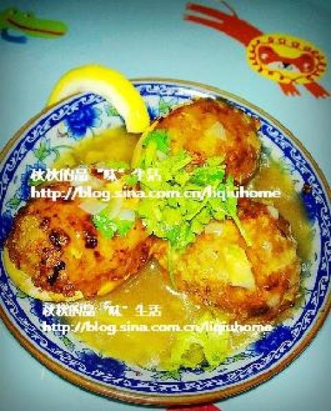 5.5、油锅3成热时放入鸡蛋,炸至表面金黄捞出。此过程要注意油温,不可过热,否则表面会糊,但肉馅不熟。