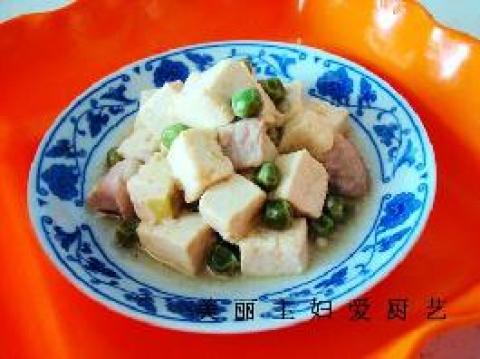1.北豆腐切成1*1*1厘米的小方块,并用热水焯一下,目的有二:一是去豆腥气,二是不易散碎。 瘦猪肉切成与豆腐相仿的小丁。 豌豆若干,不要太多,只起到点缀作用的。