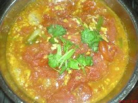 番茄300克,鸡蛋两个,葱1颗,咸猪肉100克,糖150,盐适量,香菜少许