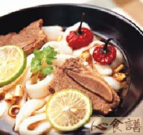 3.另将河粉烫熟装碗,加入作法2的汤与料,食用时附上柠檬片、香菜即可。