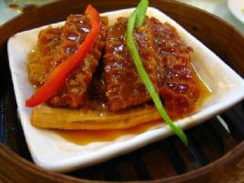2.将金钱肚、八角、花椒、葱、姜一同放入炒菜锅中干蒸1小时,取出金钱肚切成条状备用。
