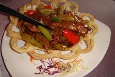 5.锅中热少许油,放入牛柳、青椒条、红甜椒条、洋葱条与调味料b,以中火快炒约1分钟,盛入鹊巢内即可。