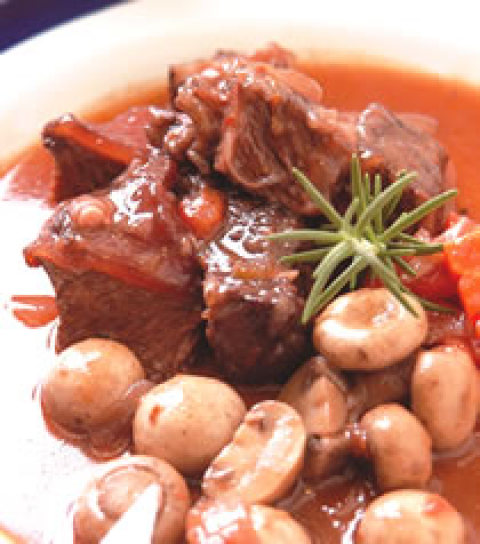 3.接着再倒少许油入锅,煸炒蒜头、洋葱,再加水和蕃茄,用大火煮开。最后将所有材料倒入不锈钢锅中,加入调味料及腌牛肉的红酒汁,以小火炖煮1小时。此时再倒一些红酒,把洋菇、红萝卜加入一起炖煮。煮到汤汁剩下少许时,即可捞起牛肉,切成小块放盘。
