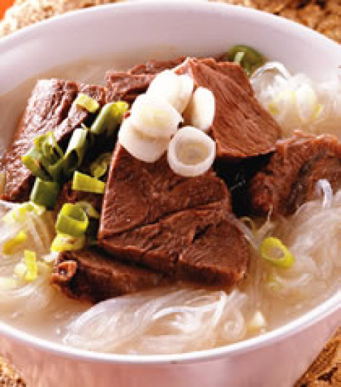 3.取一碗,将作法1的冬粉放入碗中,再倒入椰汁香茅牛肉汤,撒上葱花即完成。