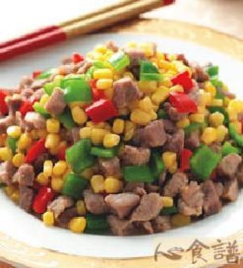 牛肉400公克,牛头牌玉米粒120公克,青椒100公克,红甜椒100公克,姜末10公克,牛头牌鲜味鸡晶1/4小匙,米酒少许,盐1/4小匙,盐少许,糖少许,酱油1/4小匙,米酒1小匙,蛋白1/2大匙,太白粉少许