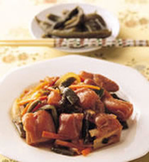 (3)起油锅,放入蒜片爆香后捞起蒜片不用,继续放入辣椒泡菜、红萝卜丝略炒,再放入作法(2)的猪脚块及调味料(3)一起拌炒,至调味均匀汤汁收干即可熄火盛盘。
