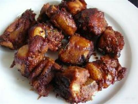 排骨600公克,蒜头5个,酱油2大匙,糖1大匙,酒1小匙,蕃茄酱2大匙