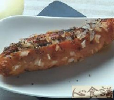 将烤熟香肠刷上基础酱料,在划开处填入洋葱末,再刷一层基础酱料,撒上黑胡椒即可。