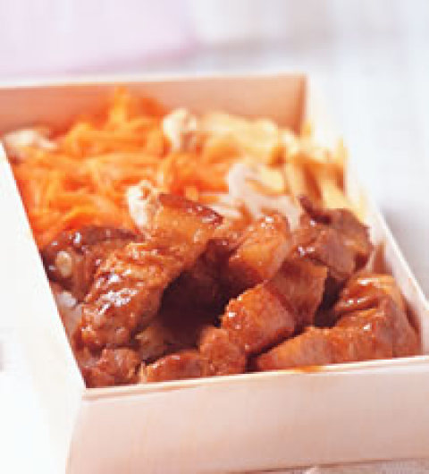4.将白饭铺入便当盒底,卤海带结、凉拌芹菜、卤蛋、素炒龙鬚菜一一排在白饭上,最后放入作法1的里肌肉片即可。