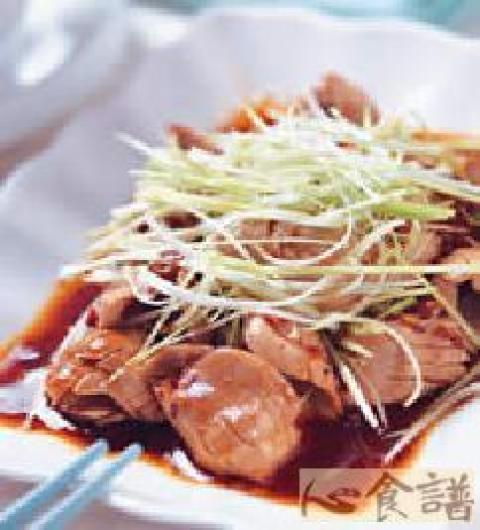 3.葱切丝,蒜头切碎洒在作法2的腰花上,再均匀淋上酸辣汁即可食用