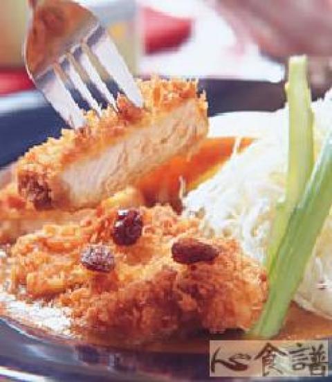 大里肌肉150公克,盐少许,胡椒粉少许,裹粉料:适量,低筋面粉50公克,咖哩粉3公克,蛋液适量,佐料:适量,葡萄干适量,咖哩猪排酱适量