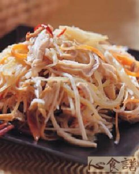 1.猪肚洗净,用小火水煮约2个小时,至熟透后沖凉切丝备用;酸菜洗净切丝;绿竹笋及胡萝卜汆烫后切丝;姜、辣椒切丝。