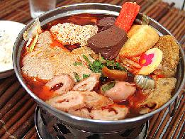 汤底:250㏄,鸡粉3茶匙,沙茶酱1大匙,火锅料:100公克,鲁大肠头1条,臭豆腐2块,高丽菜3片,韭菜2支,红萝卜片3片,鸟蛋2颗