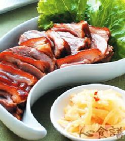 6.取一盘,摆上作法5的猪前腿肉切片,搭配作法3的酸菜丝食用即可。