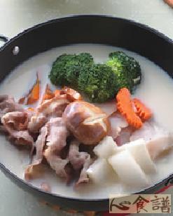 4.最后加入水芹、鱼板,再将豆浆注入,以调味料调味即可。
