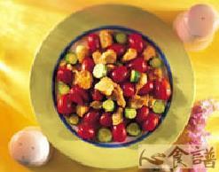 (3)将锅烧热,放入少许油,将鸡肉丁略炒至半熟后,放入蒜泥爆香,再将咖哩粉放入炒匀后,放入小番茄、小黄瓜片、糖、盐等翻炒至肉熟后即可起锅盛入盘中。
