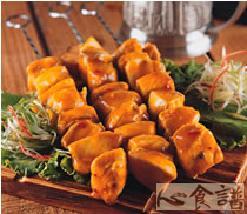 (1)鸡胸肉去皮去骨,切大丁块用长铁串串好。