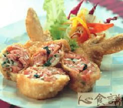 (2)把火腿、洋葱和香菜切丁,塞入作法1的鸡翅中(去骨后的缝隙),再用牙签串好,重复此动作八次,再将每只鸡翅外皮拍上少许太白粉。