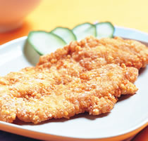 4.热油锅,待油温烧热至150℃时放入作法3的鸡排炸约2分钟,至鸡排表皮酥脆且呈现金黄色时即捞起沥油。