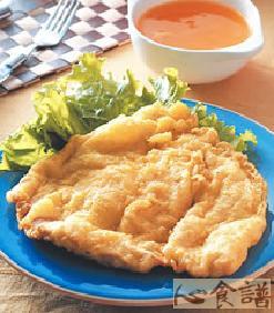 4.热一锅油至160℃,取作法2的鸡排,放入作法3的面煳中沾匀。放入油锅,中火炸约3分钟至表面金黄起锅沥油,最后沾或淋上香橙酱即可食用。