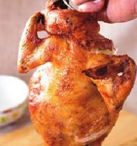 4.将作法3的鸡吊勾,放入长筒内固定,加盖以小火烤约45分钟后取出即可。