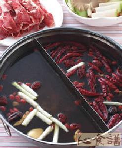 3.在作法2其中一半的锅中加入干辣椒及花椒,续滚10分钟即为红锅。