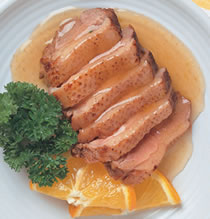 4.将调味料b入锅以小火煮开,用太白粉水勾芡,淋至鸭肉块上即可。另可取巴西里、柳橙片作装饰。