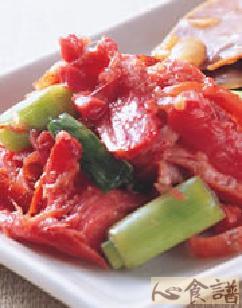 鸭赏150公克,蒜苗50公克,辣椒1/2根,蒜头3颗,芹菜2支,糖1小匙,香油2大匙