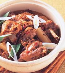1.鸭洗净后剁成块;蒟蒻切长条状;蒜苗切片;干辣椒切段;将腐皮浸泡冷水至软,备用。
