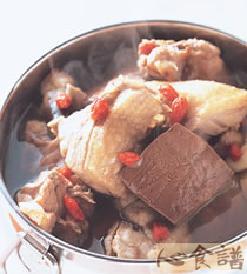 鸭1/4只,鸭血150克,丸子4颗,大白菜150克,豆腐1块,清香汤底1000㏄,药材:5克,芡实5克,熟地1片,当归1片,川芎5克,盐1/2茶匙,米酒1大匙